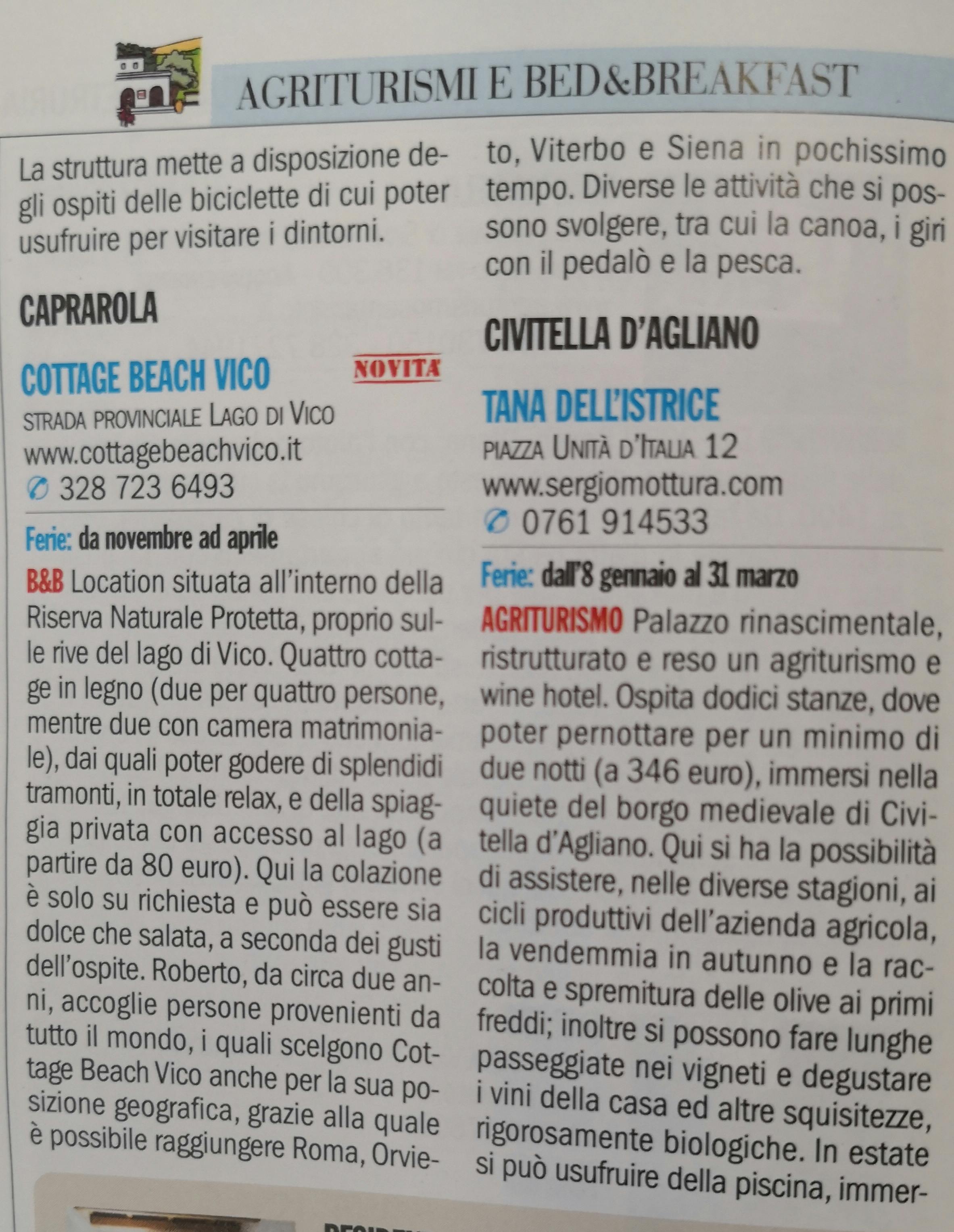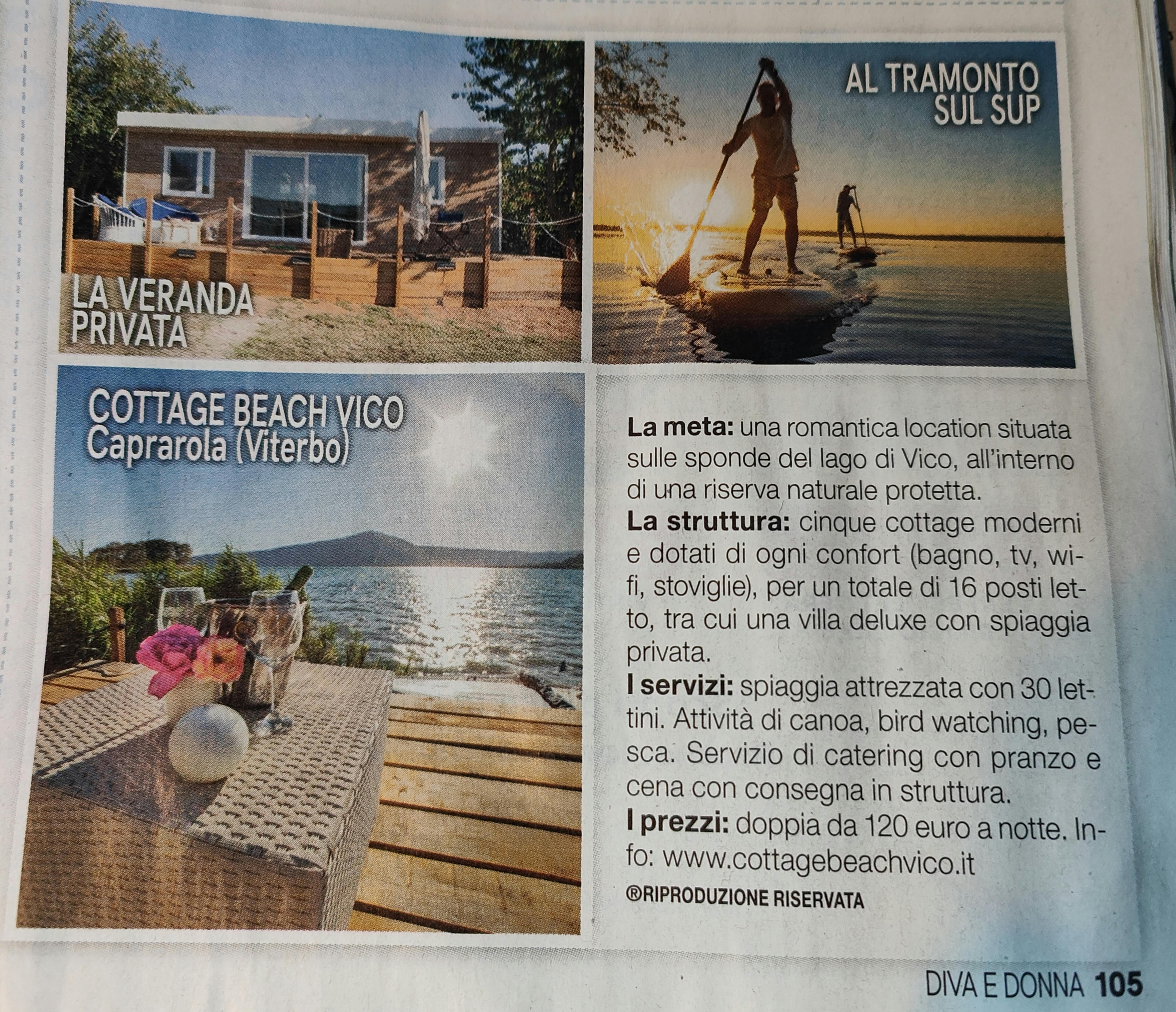 Several magazines have reviewed our structure,Cottage Beach Vico , located on Lake Vico in the Municipality of Caprarola, among the recommended destinations. These include Repubblica, one of the major national newspapers, and Diva Moderna, also of a national nature. Our structure among the first four structures located directly on the lakes and recommended as a tourist destination.